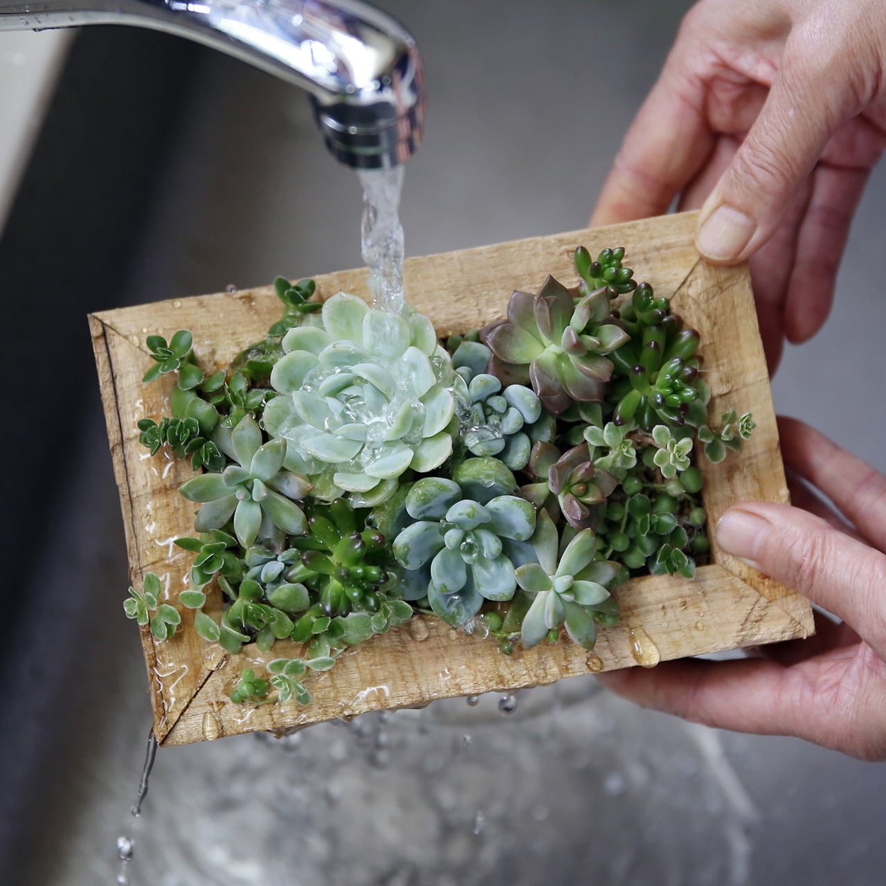 通常の多肉植物の管理と大きく違いはありません。管理の仕方でもっとも枯らしてしまう原因の一つは、用土が乾き切っていない状態で水をやりすぎてしまい、根腐れで枯らしてしまうことです。この点、寄せ植えのアートフレームは通常の植木鉢と違い裏面がメッシュとなっているため、多湿による根腐れの心配は少なく管理しやすいのもポイントです。