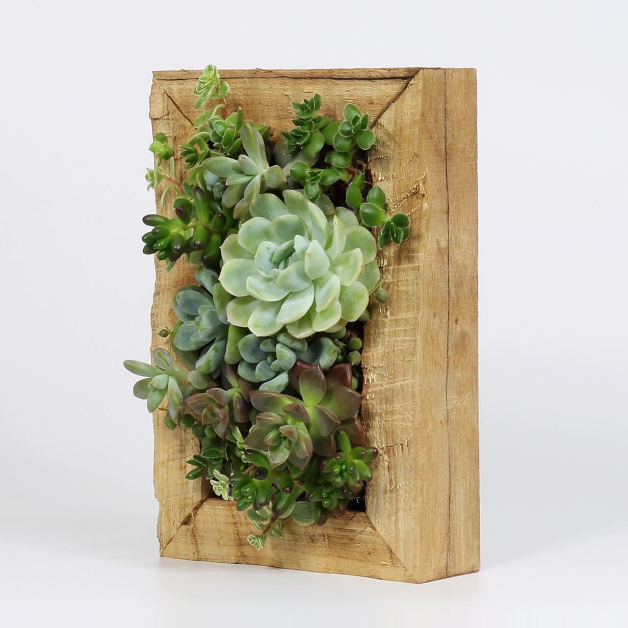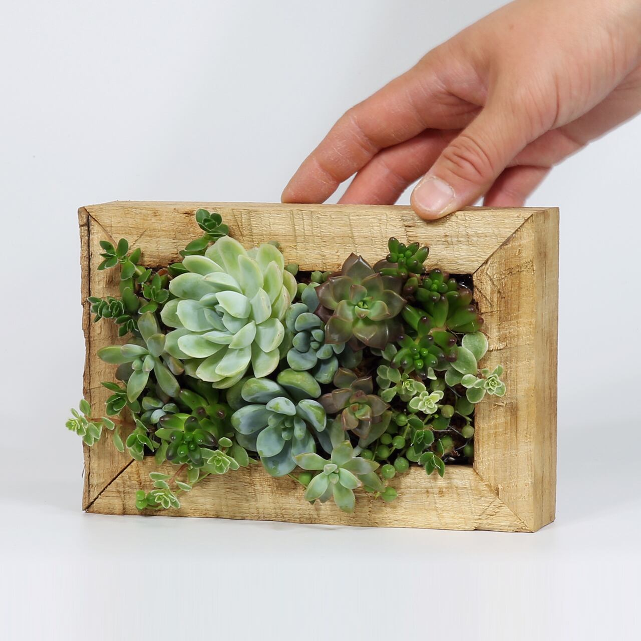 天然木のオリジナル額縁を使用した多肉植物の寄せ植えアートフレームです。人気の可愛らしい多肉植物の寄せ植えを額装したデザインなのでお祝いやプレゼントにもおすすめです。立てたり壁掛けとしても飾れるので、レイアウトの幅も広いのが特徴です。